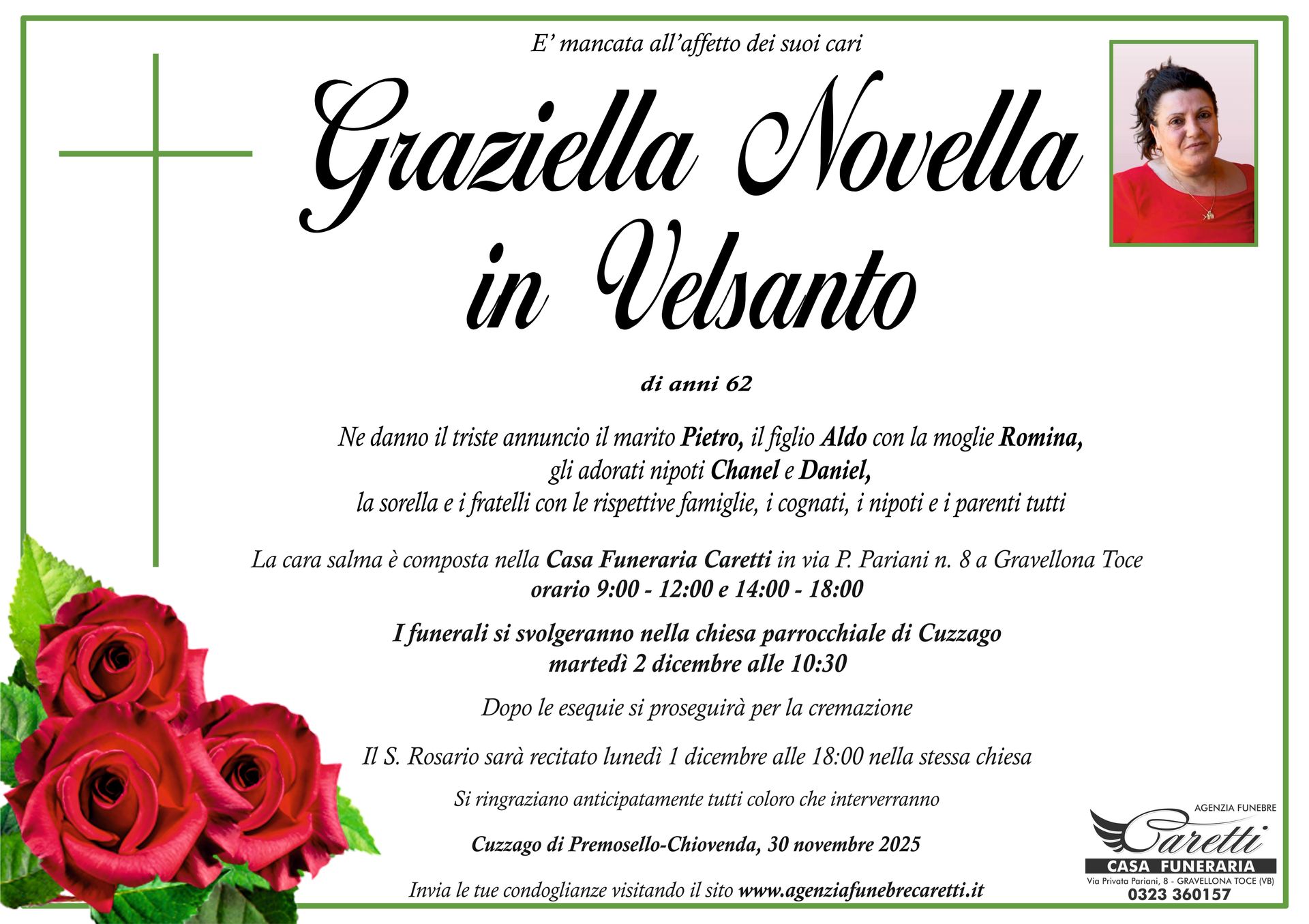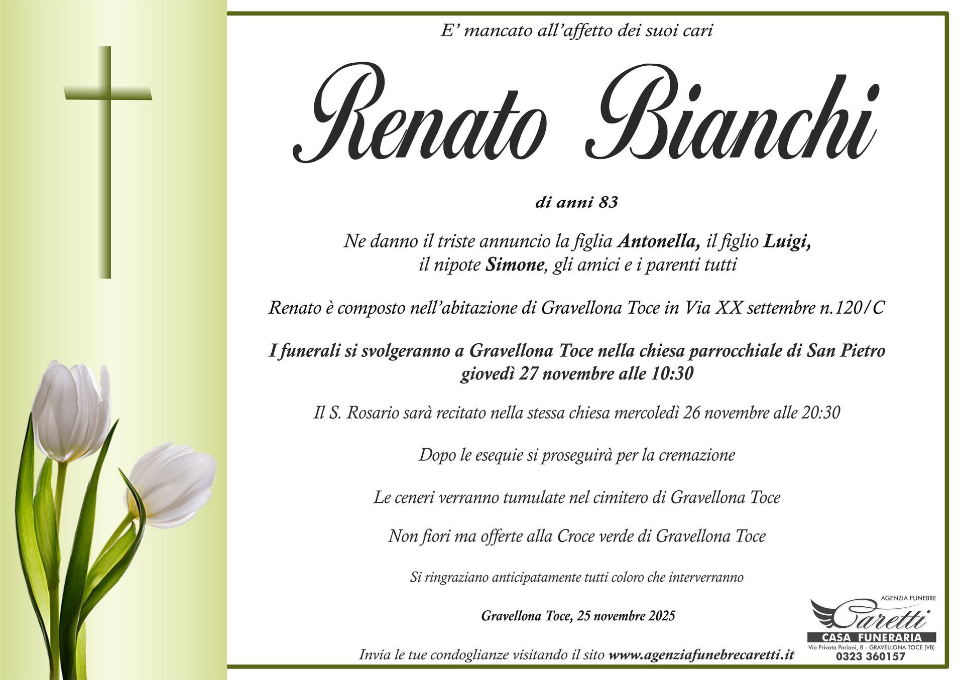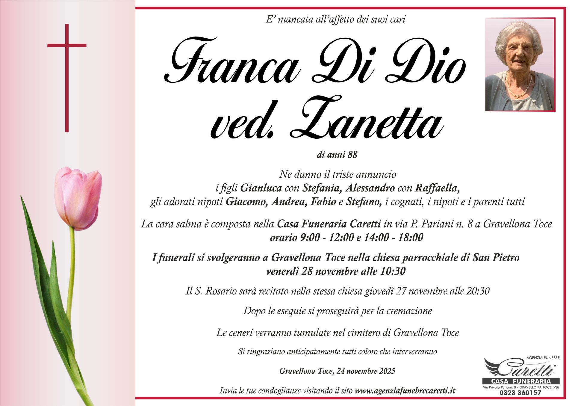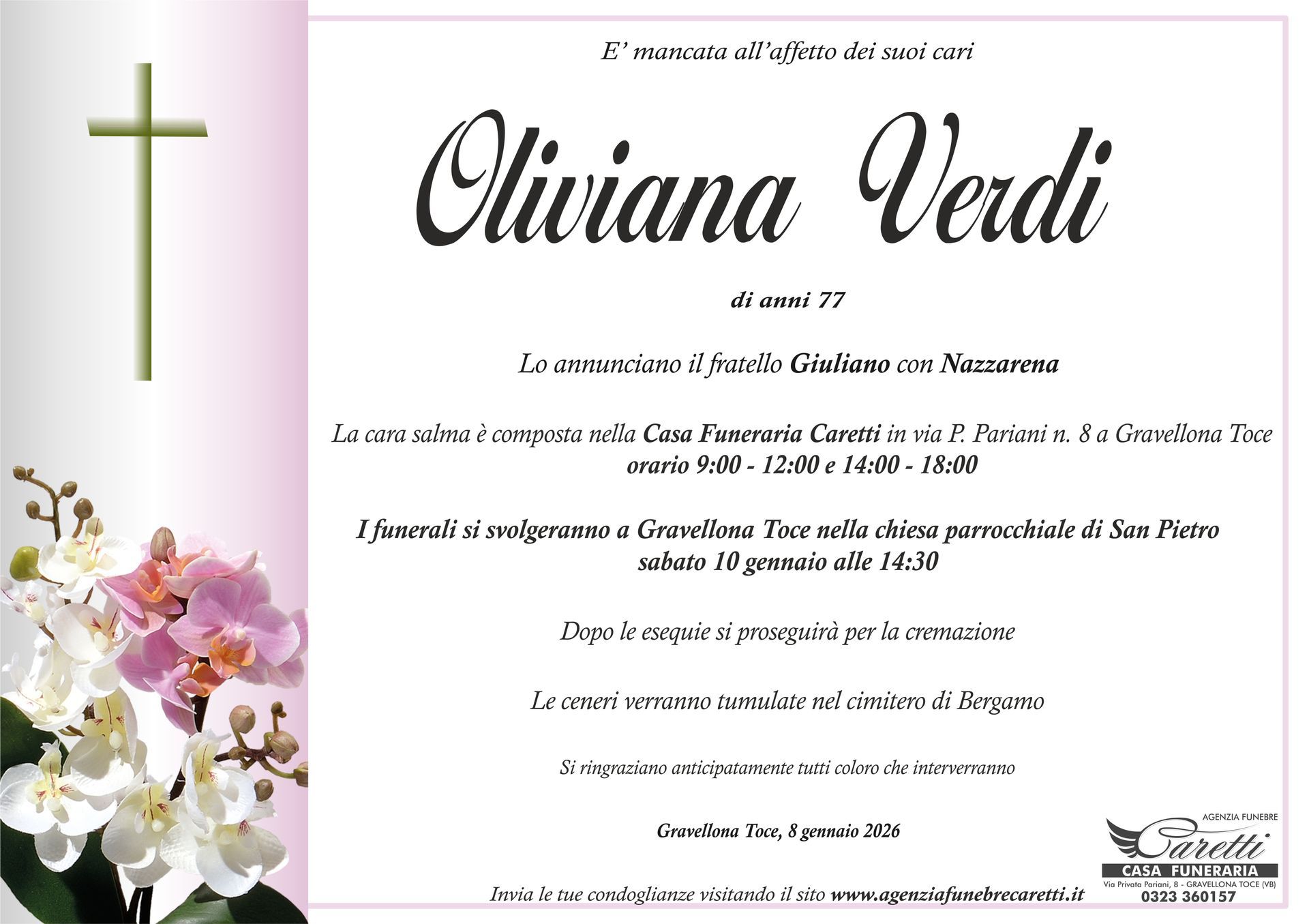 L'agenzia funebre Caretti, con sede e Casa Funeraria a Gravellona Toce in via Privata Pariani n.8, è attiva h24, 7 giorni su 7.