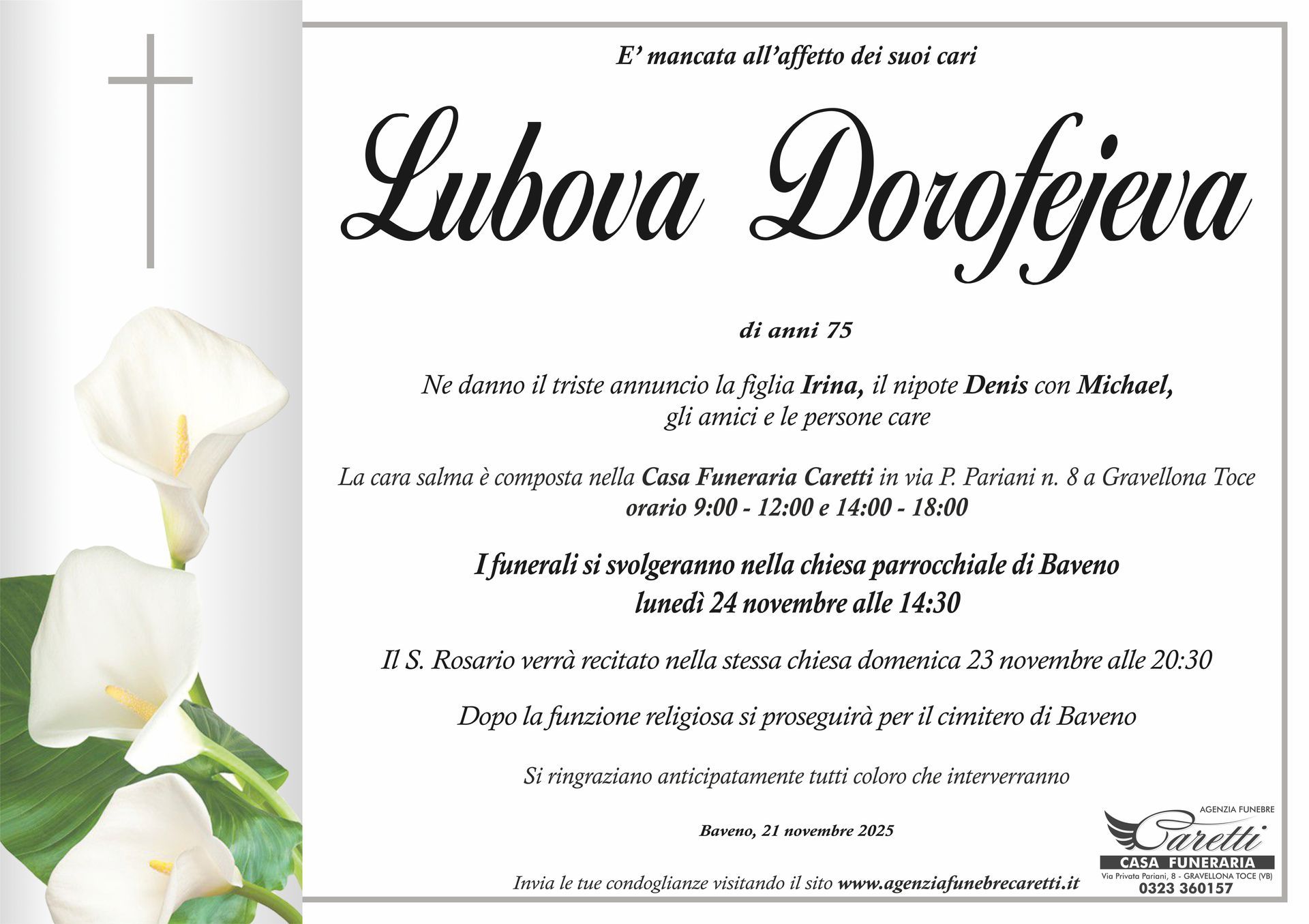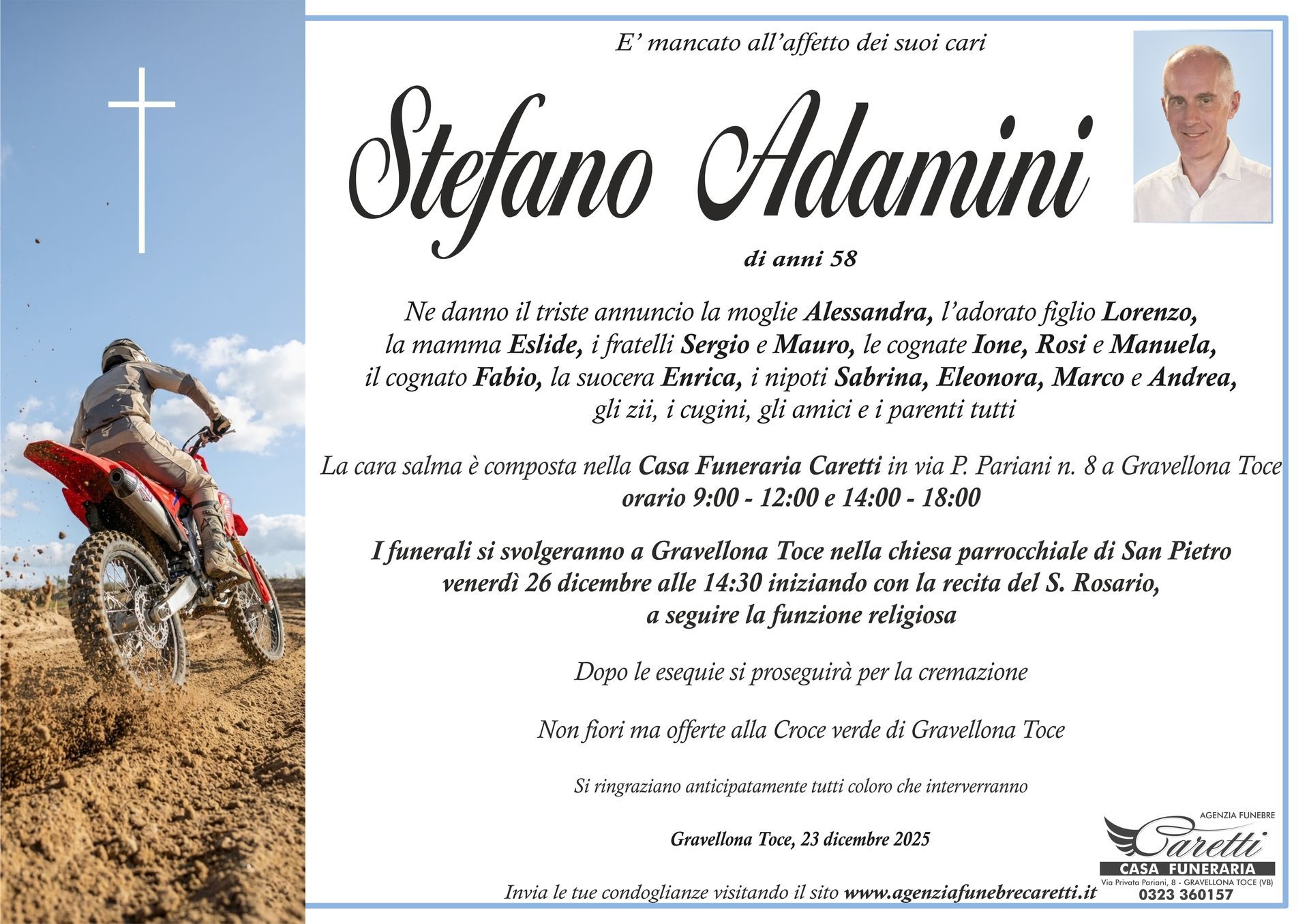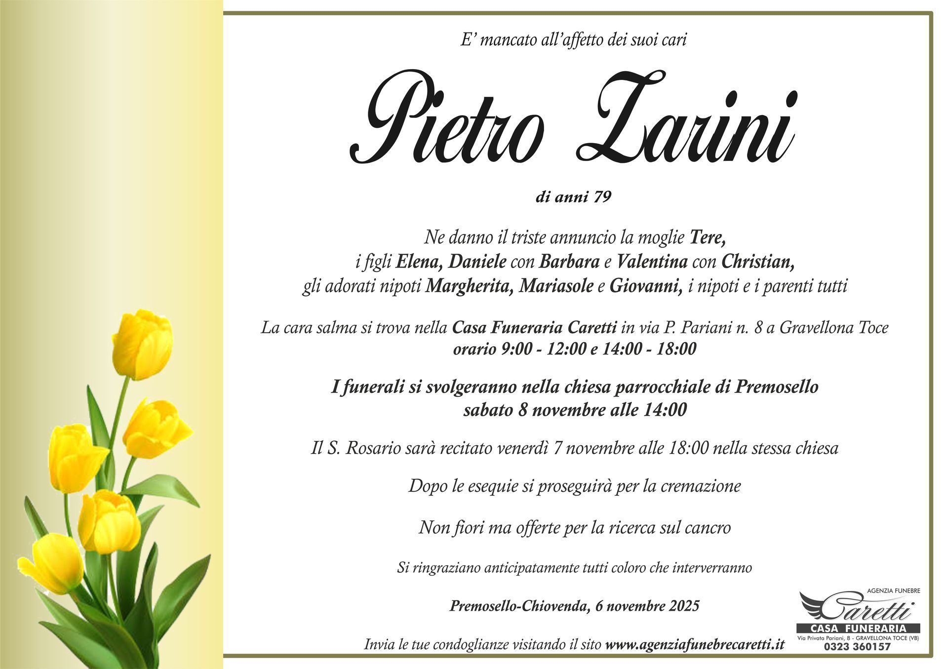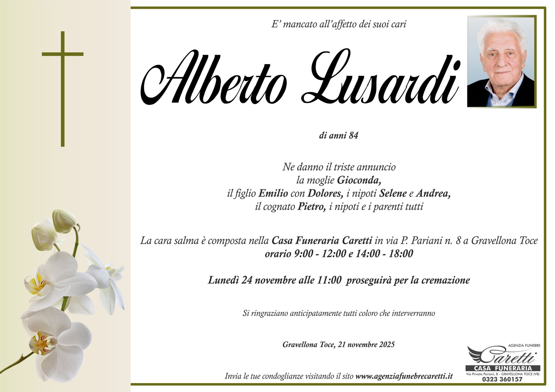 L'agenzia funebre Caretti, con sede e Casa Funeraria a Gravellona Toce in via Privata Pariani n.8, è attiva h24, 7 giorni su 7.