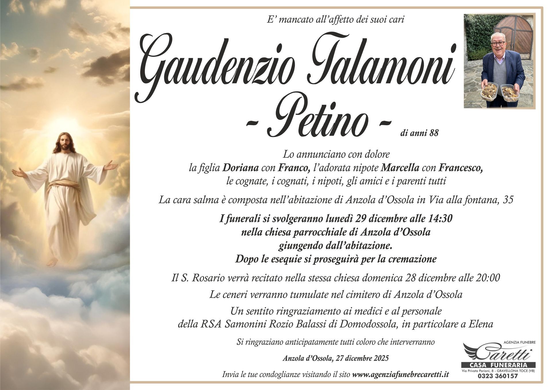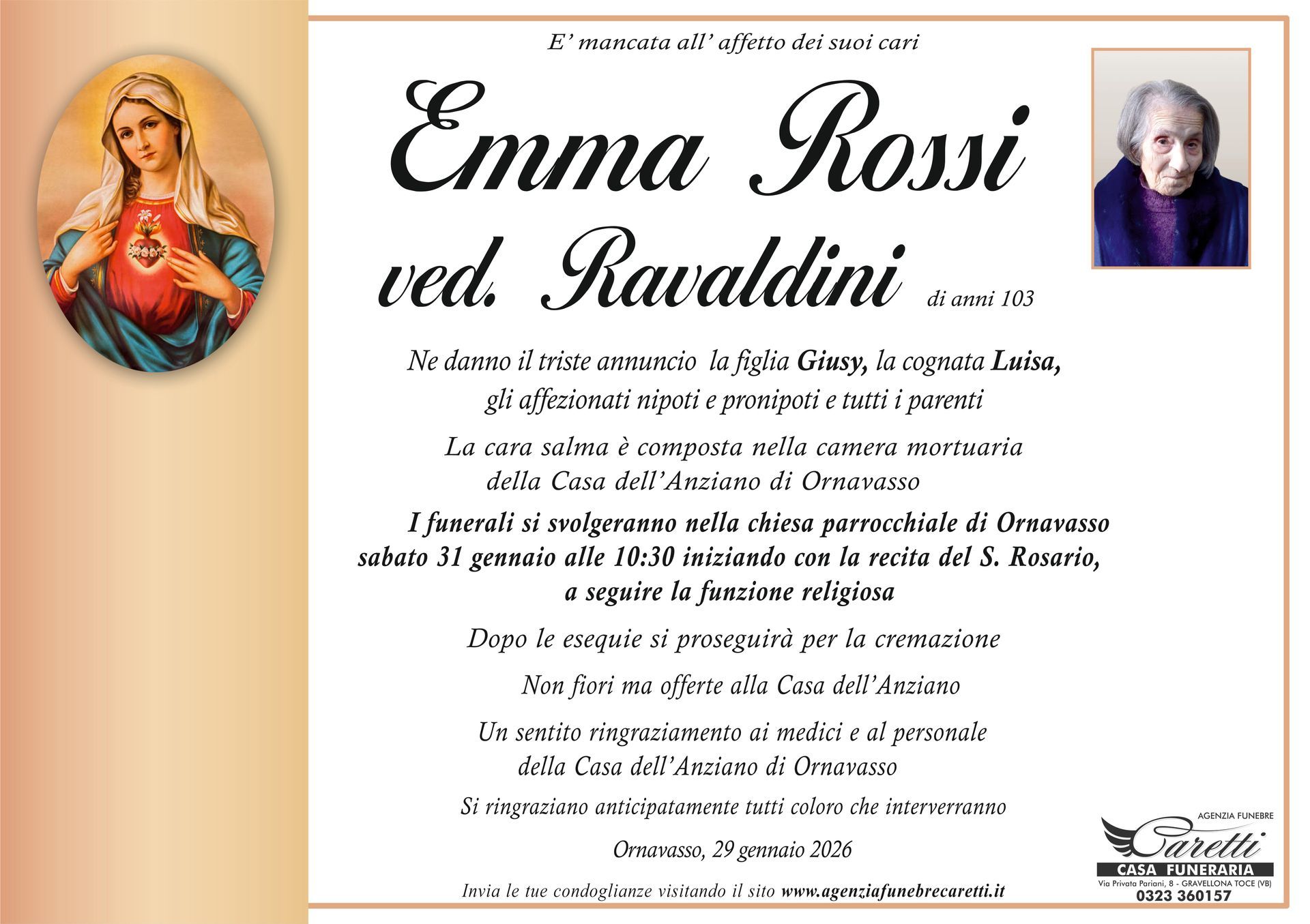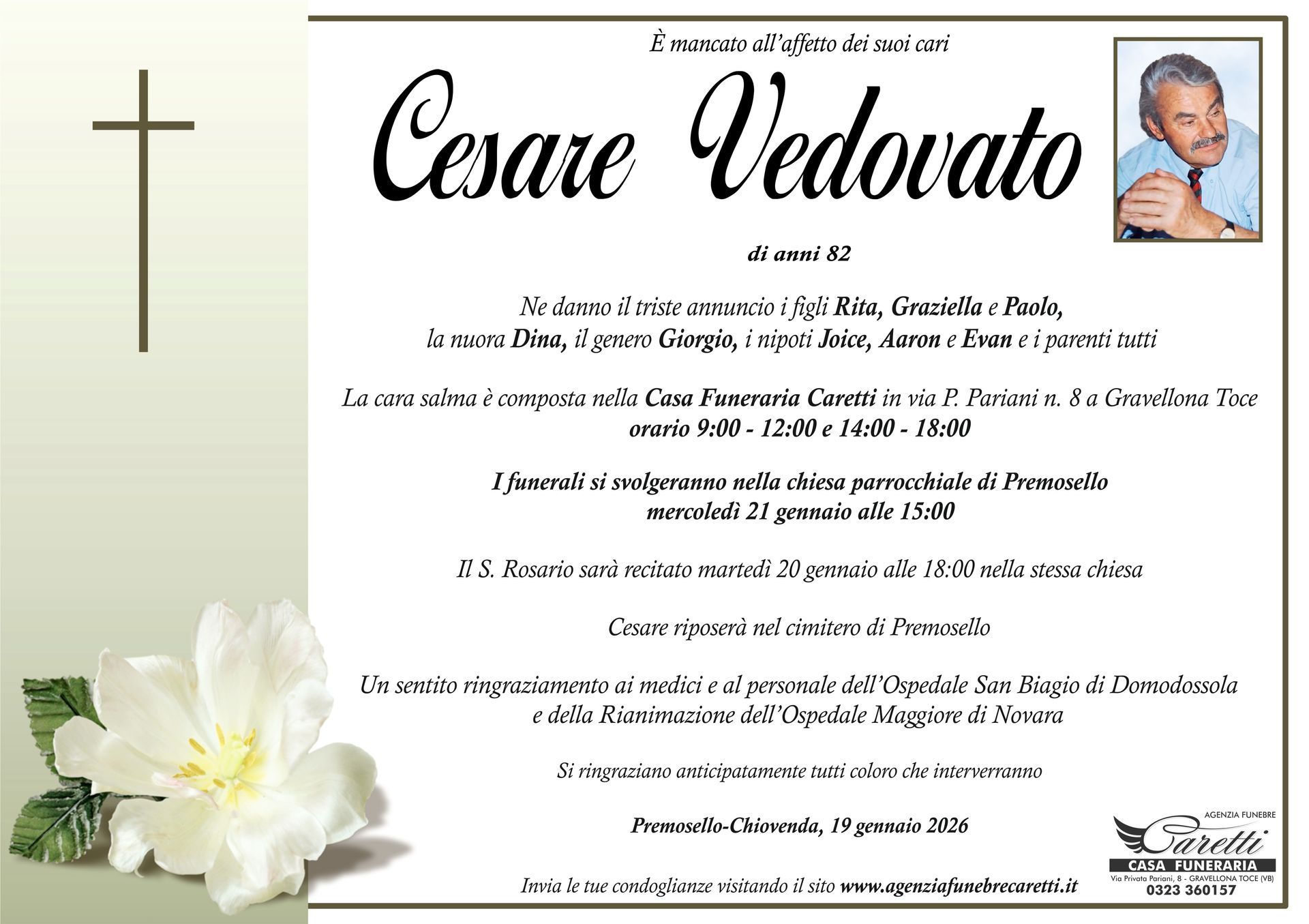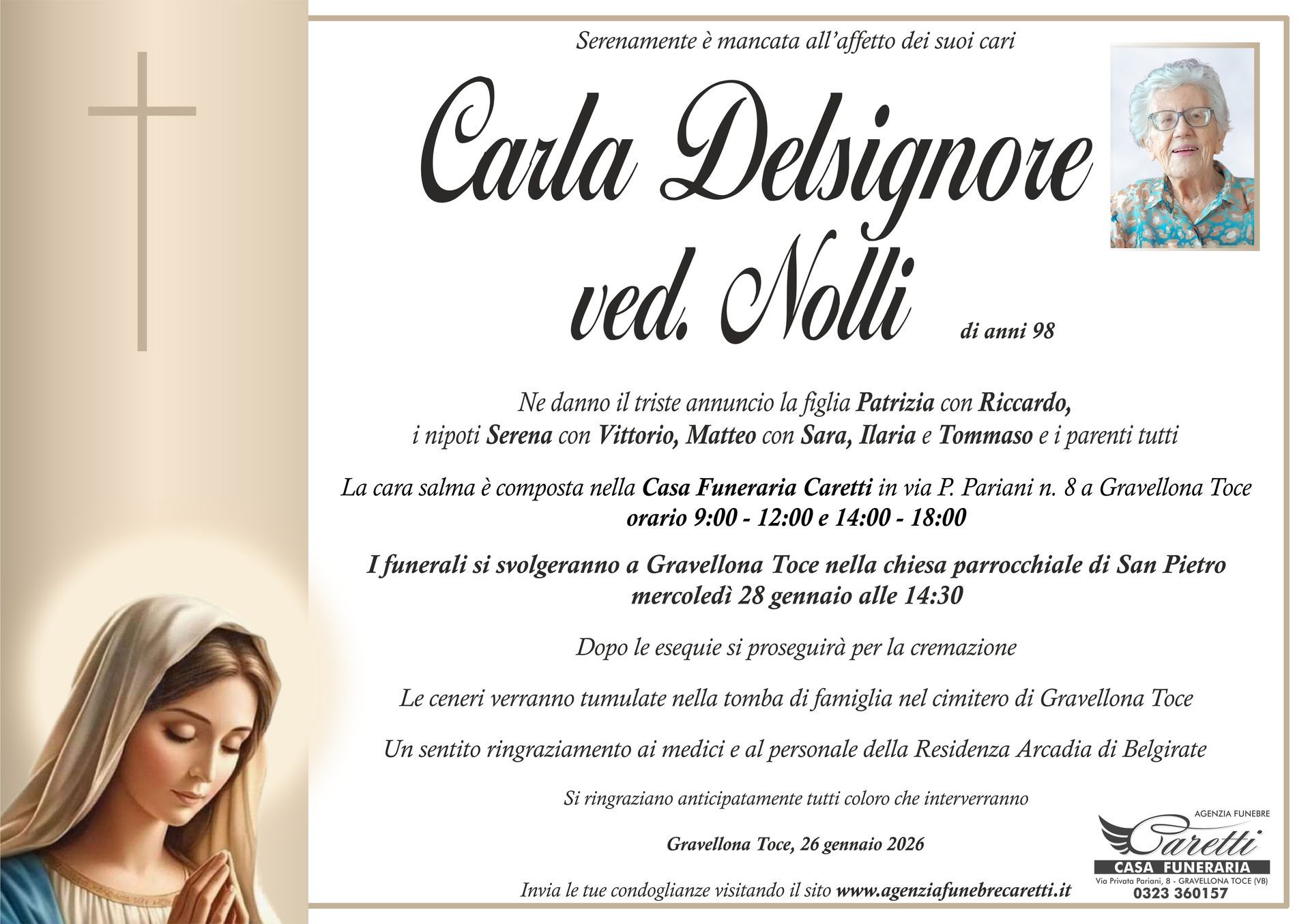 L'agenzia funebre Caretti, con sede e Casa Funeraria a Gravellona Toce in via Privata Pariani n.8, è attiva h24, 7 giorni su 7.